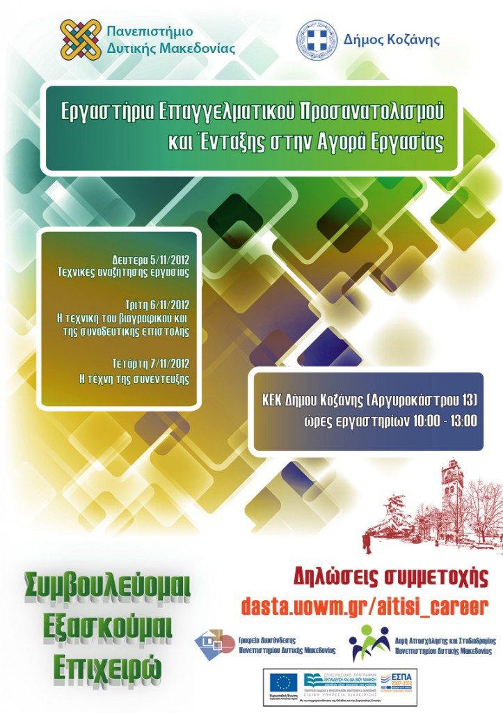 Δυστυχώς, η υποβολή αιτήσεων συμμετοχής στα εργαστήρια επαγγελματικού προσανατολισμού και ένταξης στην αγορά εργασίας έχει κλείσει, λόγω συμπλήρωσης του μέγιστου αριθμού συμμετεχόντων ανά εργαστήριο.