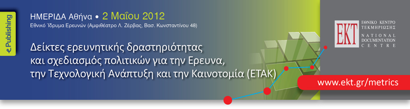 Στην ημερίδα θα παρουσιαστεί η πρόσφατη μελέτη του ΕΚΤ «Ελληνικές Επιστημονικές Δημοσιεύσεις 1996-2010: Βιβλιομετρική ανάλυση ελληνικών δημοσιεύσεων σε διεθνή επιστημονικά περιοδικά» (http://www.ekt.gr/metrics/report02)