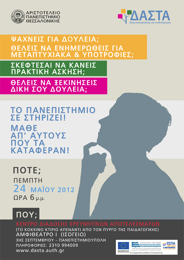 22.05.2012Η Δομή Απασχόλησης & Σταδιοδρομίας του ΑΠΘ διοργανώνει σε συνεργασία με το Γραφείο Διασύνδεσης, το Γραφείο Πρακτικής Άσκησης και τη Μονάδα Καινοτομίας & Επιχειρηματικότητας του ΑΠΘ εκδήλωση με θέμα: