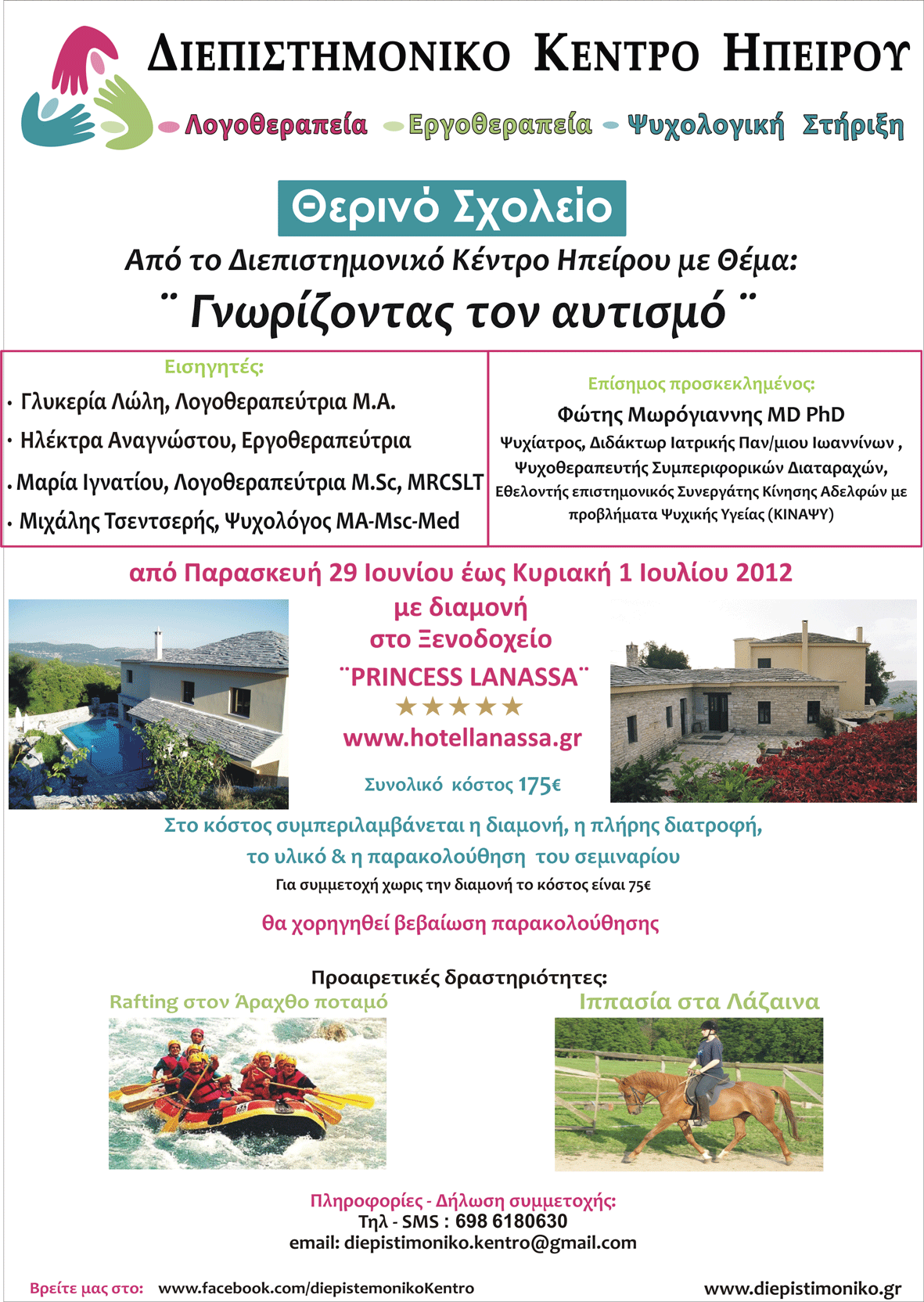 Το Διεπιστημονικό Κέντρο Ηπείρου διοργανώνει Θερινό Σχολείο με θέμα: Γνωρίζοντας τον Αυτισμό ,από την Παρασκευή 29 Ιουνίου έως την Κυριακή 1 Ιουλίου 2012, με διαμονή στο Ξενοδοχείο Princess Lanassa, στο Κωστήτσι, 25 λεπτά από τα Ιωάννινα.
