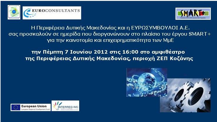 05.06.2012Η Περιφέρεια Δυτικής Μακεδονίας και η ΕΥΡΩΣΥΜΒΟΥΛΟΙ Α.Ε. στο πλαίσιο του προγράμματος SMART+ και στα πλαίσια των προσπαθειών για ανάταση της τοπικής οικονομίας, διοργανώνουν ημερίδα για την καινοτομία και την επιχειρηματικότητα των ΜμΕ.