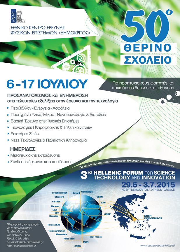 Το Εθνικό Κέντρο Έρευνας Φυσικών Επιστημών “Δημόκριτος”, συνεχίζοντας μία μακρά παράδοση, διοργανώνει από 6 έως 17 Ιουλίου 2015 Θερινό Σχολείο προσανατολισμού και ενημέρωσης, που απευθύνεται σε πτυχιούχους και τελειόφοιτους ΑΕΙ/ΤΕΙ.