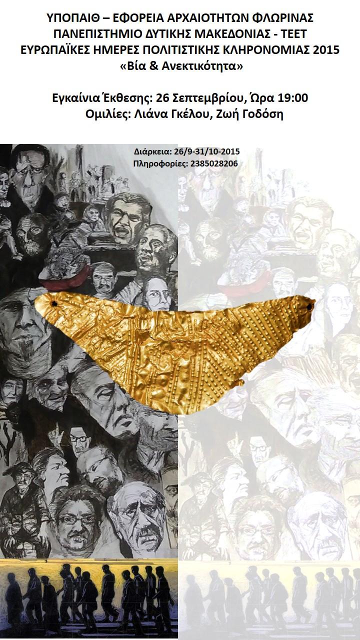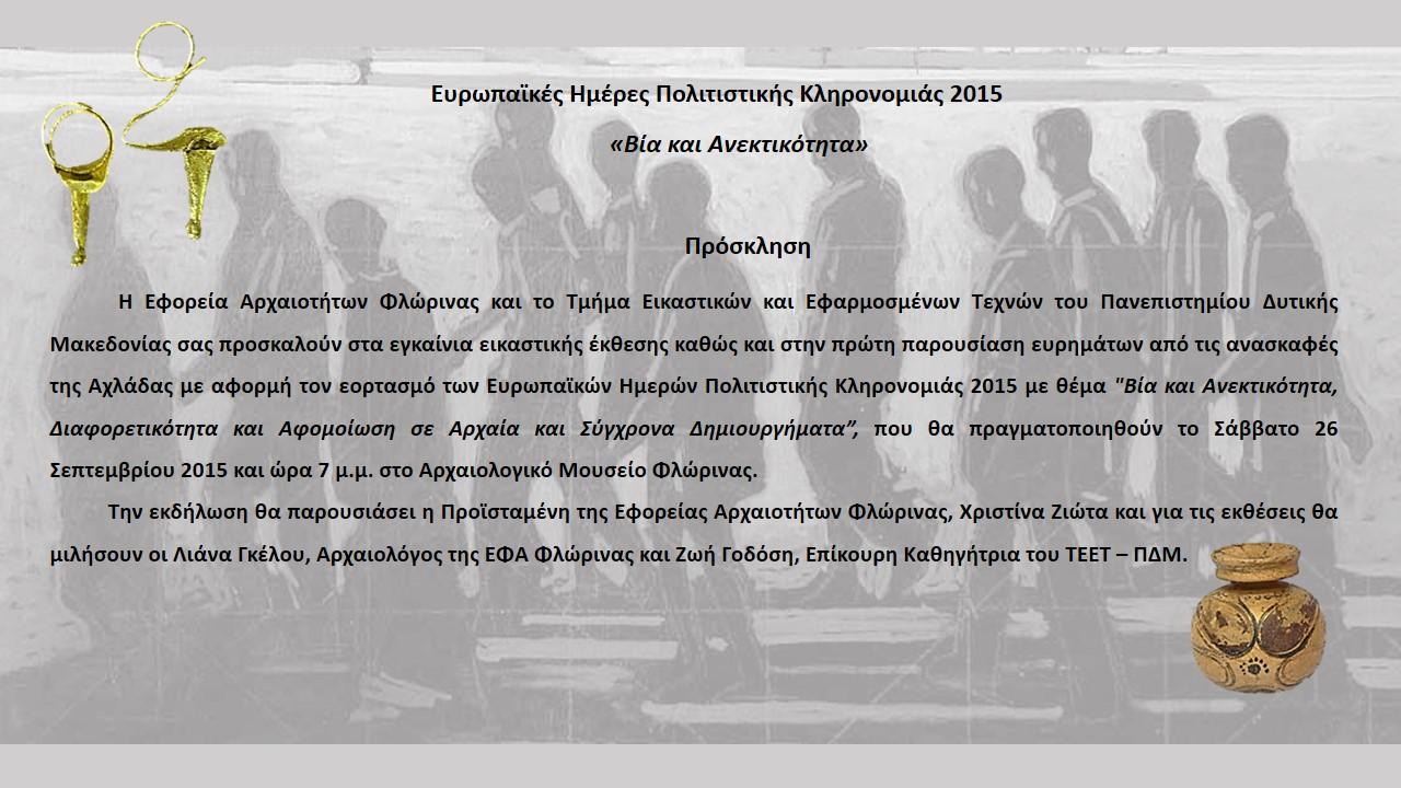 Η Εφορεία Αρχαιοτήτων Φλώρινας σε συνεργασία με το Τμήμα Εικαστικών και Εφαρμοσμένων Τεχνών του Πανεπιστημίου Δυτικής Μακεδονίας συμμετέχει στις εκδηλώσεις για τον εορτασμό των Ευρωπαϊκών Ημερών Πολιτιστικής Κληρονομιάς 2015, με θέμα «Βία και Ανεκτικότητα». Αν και η άσκηση βίας είναι ένα φαινόμενο που εκδηλώνεται με ποικίλους τρόπους στο κοινωνικό γίγνεσθαι των ευρωπαϊκών χωρών, ένα από τα ζητούμενα των κοινωνιών, θεμελιώδες για την εδραίωση του δημοκρατικού τους χαρακτήρα, είναι η ανεκτικότητα και ο σεβασμός της διαφορετικότητας.