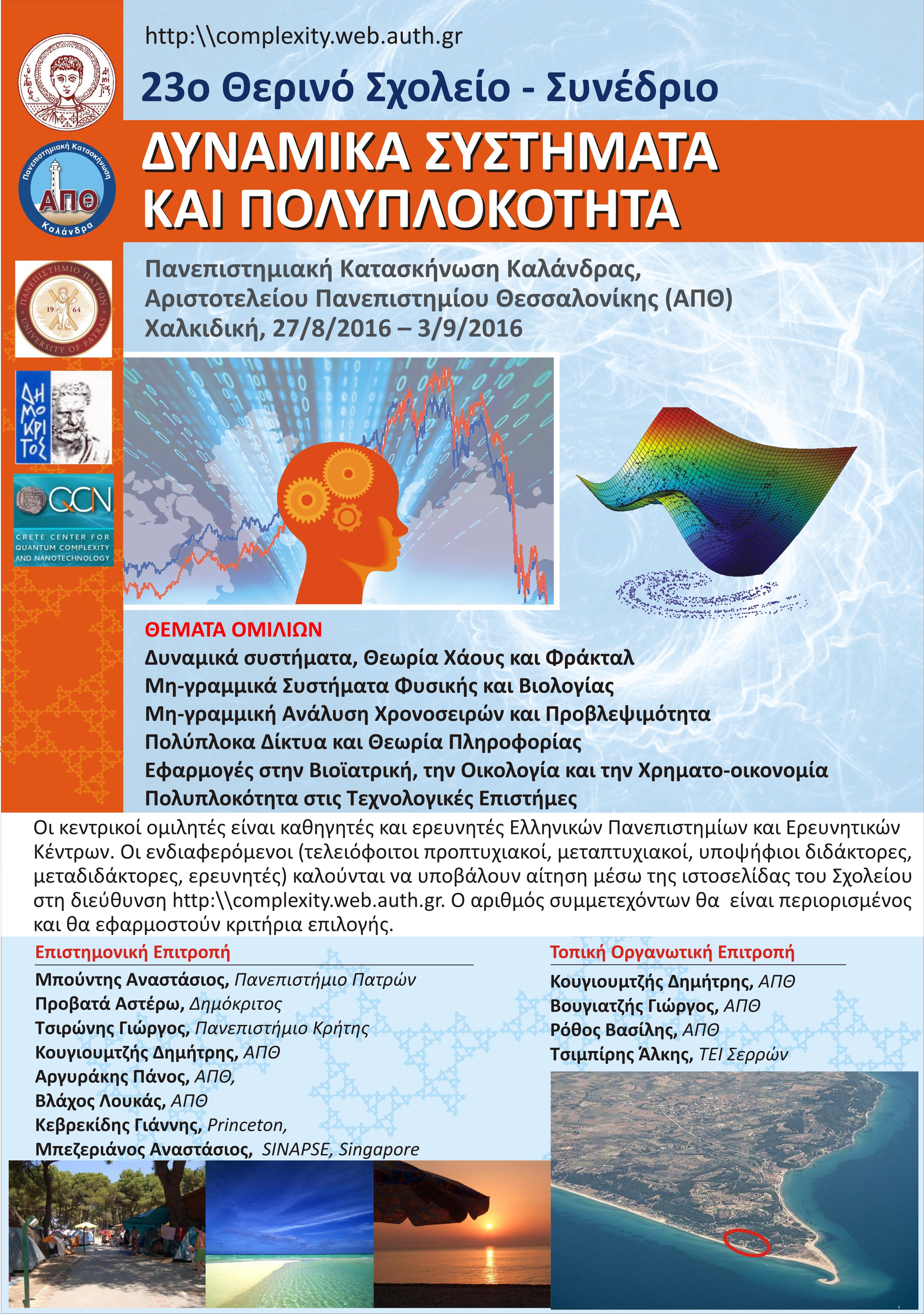Το 23ο Θερινό Σχολείο – Συνέδριο «Δυναμικά Συστήματα και Πολυπλοκότητα» θα πραγματοποιηθεί στην Πανεπιστημιακή Κατασκήνωση Καλάνδρας του Αριστοτελείου Πανεπιστημίου Θεσσαλονίκης (ΑΠΘ) στη Χαλκιδική (http://camping.auth.gr) την περίοδο 27/8/2016 – 3/9/2016.