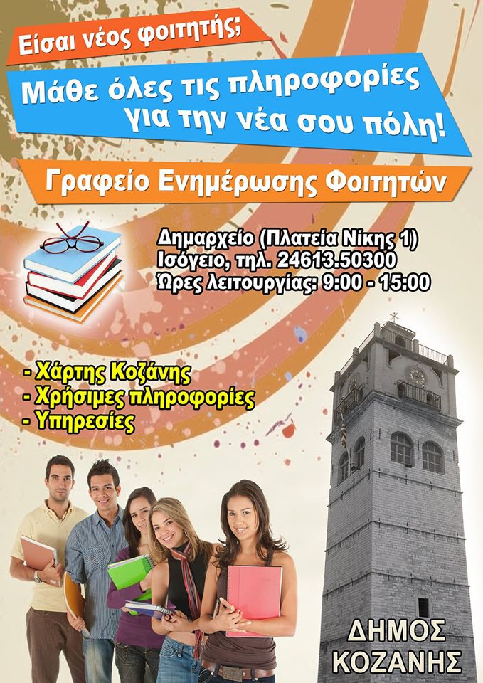 Ο Δήμος Κοζάνης προχωρά για δεύτερη συνεχόμενη χρονιά στη σύσταση γραφείου υποδοχής πρωτοετών φοιτητών. Τα αποτελέσματα της περσινής πρώτης χρονιάς, ήταν άκρως ενθαρρυντικά καθώς ήταν δεκάδες οι νέοι φοιτητές και οι γονείς που αναζήτησαν και βρήκαν πληροφορίες για το νέο τόπο διαμονής τους.