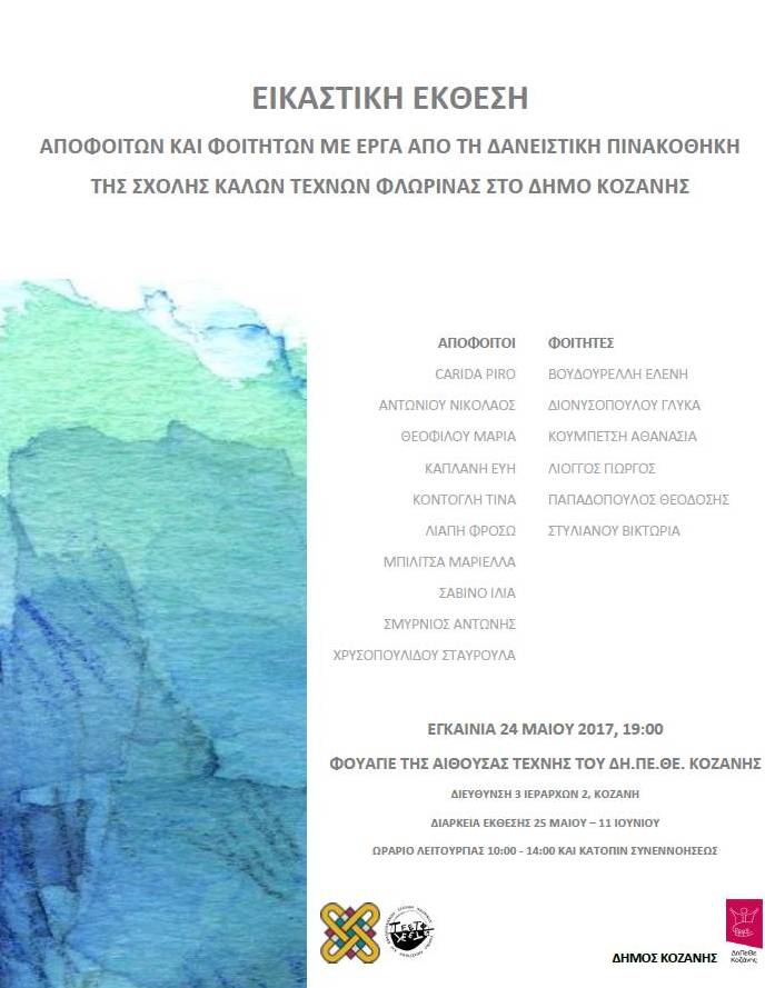 Την Τετάρτη 24 Μαίου 2017, στις 19:00 θα πραγματοποιηθούν στο φουαγιέ της Αίθουσας Τέχνης του Δημοτικού Θεάτρου Κοζάνης (3 Ιεραρχών 2, Κοζάνη) εγκαίνια έκθεσης αποφοίτων και τελειοφοίτων της Σχολής Καλών Τεχνών του Τμήματος Εικαστικών και Εφαρμοσμένων Τεχνών του Πανεπιστημίου Δυτικής Μακεδονίας (ΤΕΕΤ). Στην έκθεση παρουσιάζονται κυρίως έργα της Δανειστικής Πινακοθήκης του ΤΕΕΤ. Η Δανειστική Πινακοθήκη είναι ένας πρωτοποριακός θεσμός: κάθε απόφοιτος του τμήματος παραχωρεί ένα του έργο στο Τμήμα που γίνεται απόκτημα της Πινακοθήκης. Τα έργα παραχωρούνται σε φορείς που θέλουν να τα τοποθετήσουν στους χώρους τους. Ο Δήμος Κοζάνης και το ΤΕΕΤ έχουν υπογράψει διμερές μνημόνιο για πραγματοποίηση σειράς συνεργασιών στον πολιτιστικό τομές με επίκεντρο τα εικαστικά. Σο πλαίσιο αυτής της συνεργασίας πραγματοποιείται η έκθεση των έργων που έχουν παραχωρηθεί από το ΤΕΕΤ στον Δήμο Κοζάνης με μακρόχρονο δανεισμό.