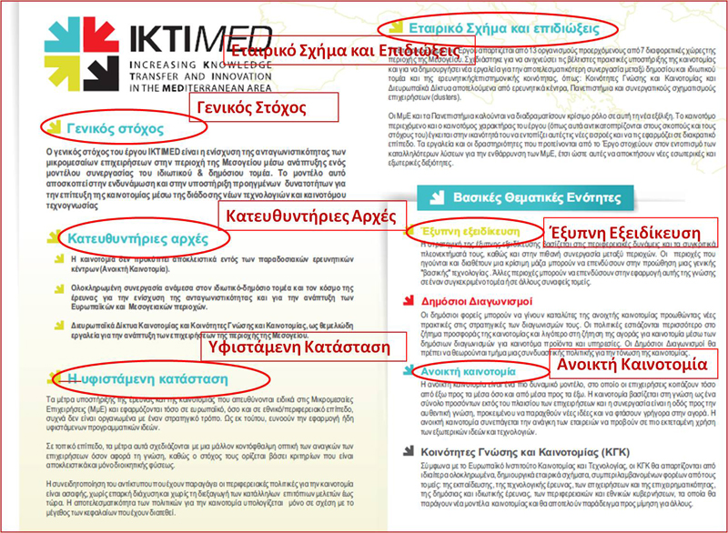 Ο γενικός στόχος του έργου IKTIMED είναι η ενίσχυση της ανταγωνιστικότητας των μικρομεσαίων επιχειρήσεων στην περιοχή της Μεσογείου μέσω δημιουργίας και ανάπτυξης ενός καινοτόμου μοντέλου συνεργασίας του ιδιωτικού & δημόσιου τομέα. Το μοντέλο αυτό αποσκοπεί στην ενδυνάμωση και στην υποστήριξη προηγμένων μεθοδολογιών για την επίτευξη της καινοτομίας μέσω της διάδοσης νέων τεχνολογιών και καινοτόμου τεχνογνωσίας.