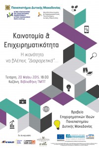 Ημερίδα με τίτλο Καινοτομία & Επιχειρηματικότητα: Η Ικανότητα να βλέπεις «Διαφορετικά» – Βραβεία Επιχειρηματικών Ιδεών φοιτητών του Πανεπιστημίου Δυτικής Μακεδονίας | Κοζάνη, 20.05.2015