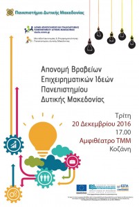 Απονομή Βραβείων Επιχειρηματικών Ιδεών Πανεπιστημίου Δυτικής Μακεδονίας | Αμφιθέατρο ΤΜΜ 5 μ.μ., Κοζάνη 20/12/2016